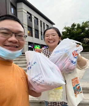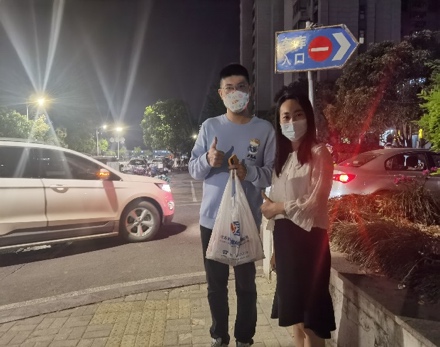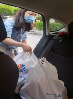 研究生辅导员李佳老师和教务员任洁菲老师主动关心校外走读生的学习生活情况,为居住在和园、仙林湖附近7个小区的11位走读生派送公司的防疫慰问品,让每位同学都能感受到公司的温暖和牵挂,安心地居家科研。
