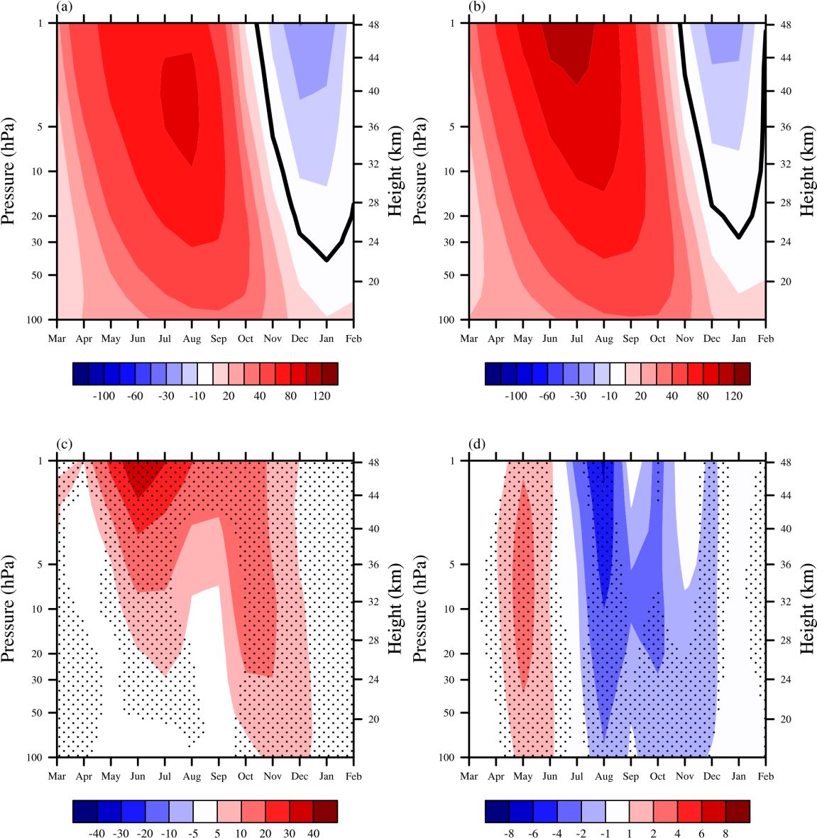 图1. 1995-2014年副极地地区(55°-65°S)气候态平均纬向风季节变化(单位:m s-1)(a)JRA55,(b)旧方案,(c)新方案减JRA55和(d)新方案减旧方案,粗实线代表零风速线,打点区域表示差值通过90%显著性检验