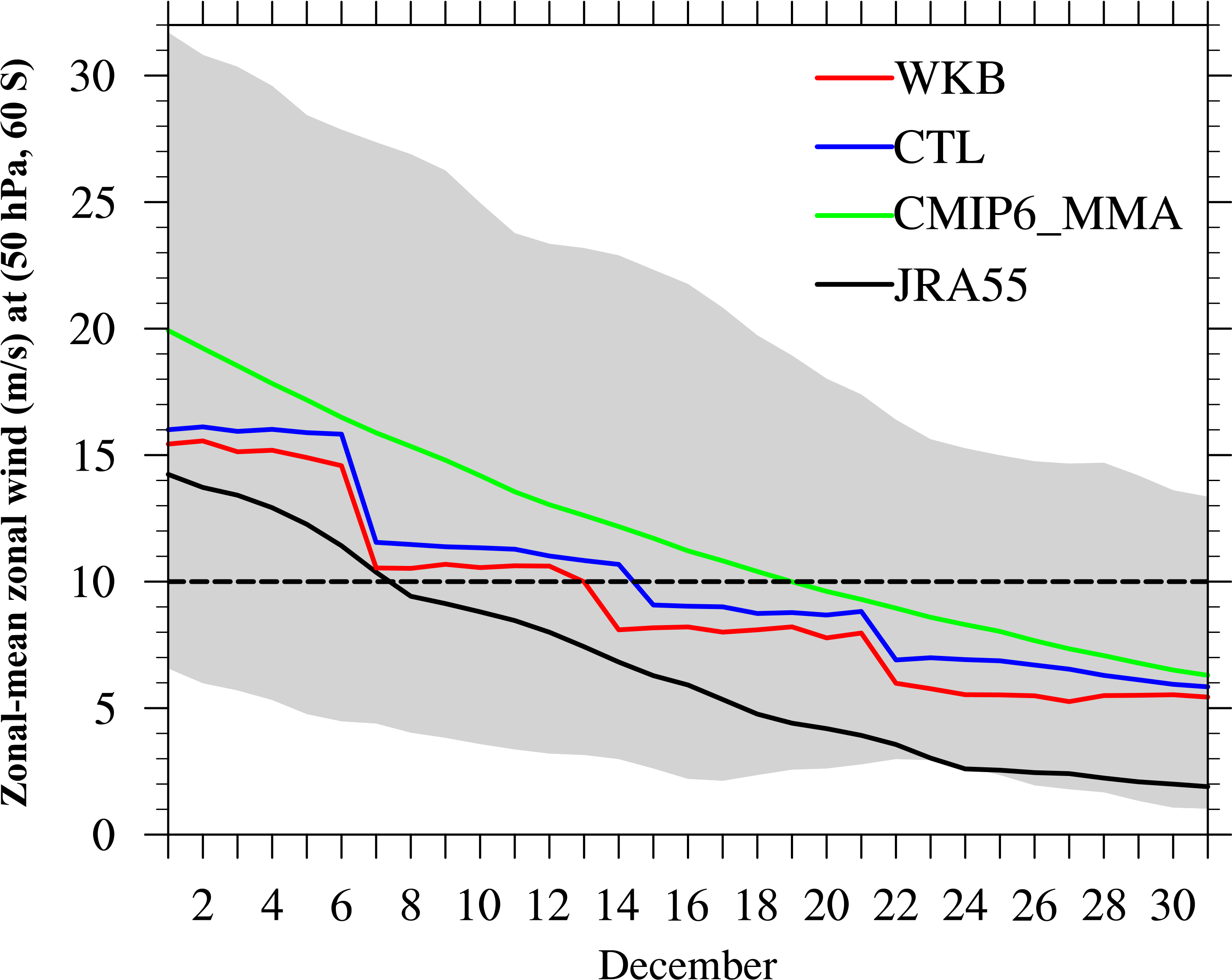 图3. 南极极涡破碎时间,其中黑色实线代表JRA55破碎时间,绿色实线代表CMIP6多模式平均破碎时间,蓝色实线代表旧方案破碎时间,红色实线代表新方案破碎时间