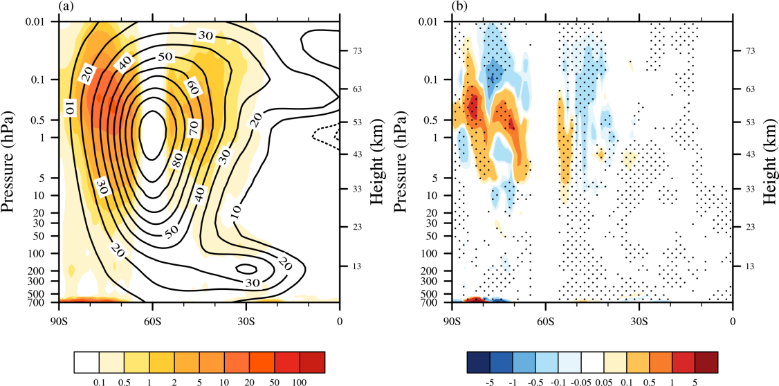图2. 1995-2014年南半球冬季纬向平均地形重力波垂直分布(单位:m s-1 day-1),(a)旧方案和(b)新方案减旧方案,打点区域表示差值通过90%显著性检验