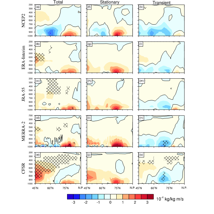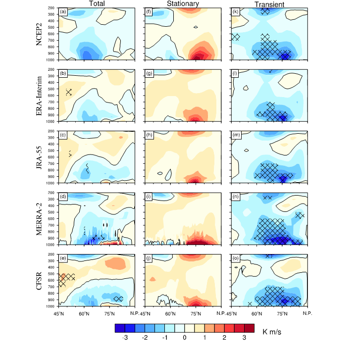 图2 冬季纬向平均总扰动向极热量输送(左列)、定常波向极热量输送(中间列)和瞬变波向极热量输送(右列)在1999~2016年与1981~1998年的差值的高度-纬度剖面图(单位:K m/s)。从上至下分别为NCEP2、ERA-Interim、JRA-55、MERRA-2和CFSR再分析资料。打叉区域表示通过90%的显著性t检验。