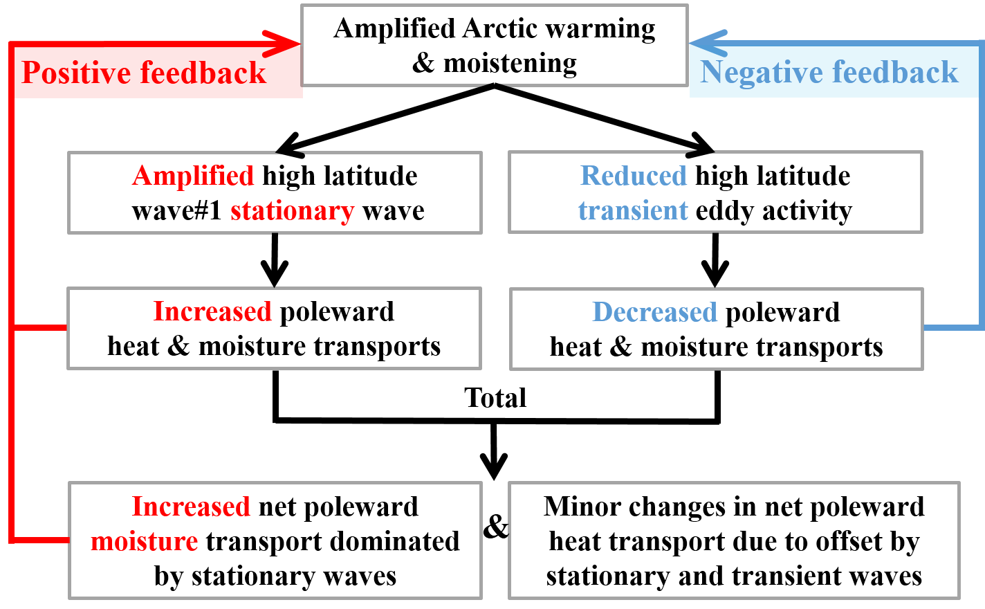 北极是全球气候变化的敏感区和关键区。近几十年来,北极的增暖速率是全球平均的两倍以上,这一现象被称为“北极放大效应”(Arctic amplification)。北极放大效应可能对中纬度大尺度环流以及极端天气等产生重要影响,但它与中纬度气候变化的联系目前还存在很大的争议。此外,冬季中纬度波流系统的变化会引起怎样的向极热量和水汽输送反馈仍不清楚。因此,研究北极放大效应对中高纬大气向极输送的影响及其反馈作用,有利于弄清北极对中纬度天气气候的影响,并且完善对北极放大效应形成机制的认识。