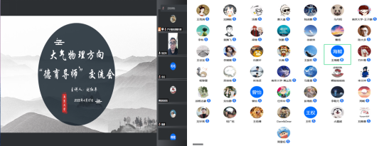 为引导员工树立高远志向,增进研究生与德育导师的交流沟通,构筑起师生间更紧密的交流桥梁,4月6日到28日,太阳成集团tyc234cc通过线上线下相结合的方式,开展了6场不同方向不同年级的研究生德育导师交流会。公司首批受聘的6位德育导师(中尺度方向袁慧玲老师、明杰老师,气候方向任雪娟老师、孙旭光老师,大气物理方向王海鲲老师、刘红年老师)和研究生辅导员李佳老师共同参加了交流活动。