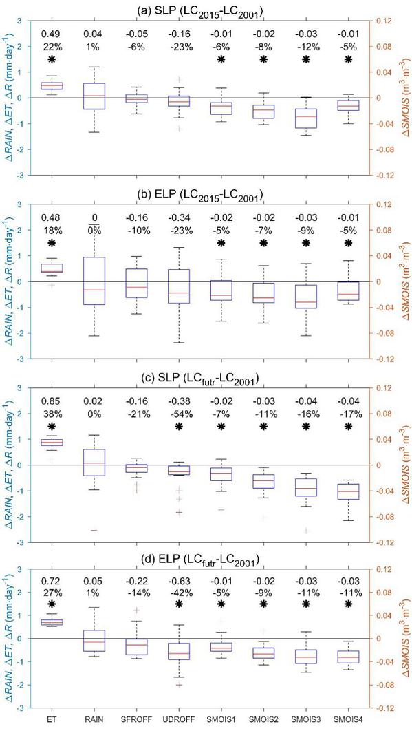 图2. 6-9月平均蒸散发(ET;单位:mm·day-1)、降水(RAIN;单位:mm·day-1)、地表径流(SFROFF;单位:mm·day-1)、地下径流(UDROFF;单位:mm·day-1)、第1层土壤湿度(SMOIS1;0-10cm;单位:m3·m-3)、第2层土壤湿度(SMOIS2;10-40cm;单位:m3·m-3)、第3层土壤湿度(SMOIS3;40-100cm;单位:m3·m-3)和第4层土壤湿度(SMOIS4;100-200cm;单位:m3·m-3)变化的盒须图。a和b:“退耕还林”实施以来的变化;c和d:继续实施“退耕还林”后的变化。a和c:南黄土高原(SLP)的区域平均值;b和d:东黄土高原(ELP)的区域平均值。第1行和第2行数字分别表示20年平均的绝对变化和相对变化。