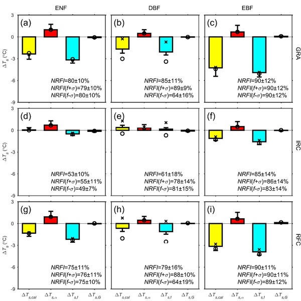 图1. 观测得到的地表温度变化(△Ts,obs;单位:℃)、计算得到的地表温度变化(△Ts,cal;单位:℃)、与反照率变化有关的地表温度变化(△Ts,α;单位:℃)、与能量再分配因子变化有关的地表温度变化(△Ts,f;单位:℃)以及与土壤和生物质储存能量变化有关的地表温度变化(△Ts,G;单位:℃),均为森林减去空地。每一个子图表示一种造林方案对应的地表温度变化。第1、2和3列分别表示空地变成常绿针叶林(ENF)、落叶阔叶林(DBF)和常绿阔叶林(EBF)对应的地表温度变化;第1、2和3行分别表示草地(GRA)、灌溉农田(IRC)和雨养农田(RFC)变成森林对应的地表温度变化。