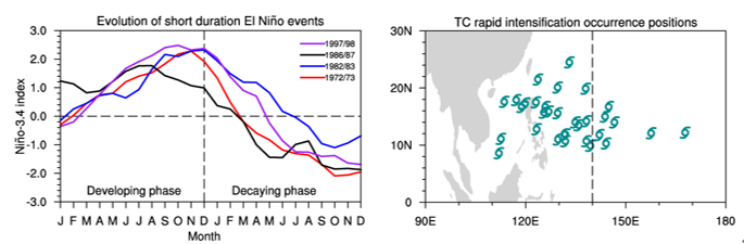 Typhoons, or tropical cyclones (TCs) are one of the severest sudden onset natural disasters in the world and exhibit the highest frequency over the North Pacific (WNP) basin. As WNP TCs inflict significant damage and loss of life to the coastline of China each year, it is important to understand their variability and underlying mechanisms for the benefit of national economy and people’s livelihood. WNP TCs classified as severe and super typhoons mostly undergo a rapid-intensification (RI) before making landfall. Yet the roles of relative contributors in this intensity change remain unclear, bringing much challenge to RI forecasting. The unavoidable delay in disaster prevention and mitigation has caused heavy losses in affected areas. El Niño events are known to be important contributors to the WNP TC RI, and can be categorized into two subtypes based on their durations. In the new study, researchers investigated the respective impacts of the two subtypes and found that during short duration (SD) El Niño events, the WNP tropical cyclone rapid-intensification mean occurrence position migrates westward by ~8.0° longitude (Fig. 1). In other words, the WNP TC RI occurs much closer to the East Asian mainland during SD El Niño events, which increases the chances for severe typhoon genesis in China’s coastal waters. The westward migration of RI occurrence also brings great challenge to forecasts and narrows the time window for disaster prevention and mitigation, leaving China’s coastal areas more vulnerable in typhoon hazards. The authors further point that, during the summer of SD El Niño events, the upper Ocean Heat Content (OHC) increase over the South China Sea and the Western Philippine Sea are large enough to provide persistent energy fueling for the TC intensification, while during the summer of LD El Niño events the OHC increase is lacking. In addition, as the frequency of SD El Niño is projected to increase under global warming, more near-land TC RI would occur in China’s coastal areas because of high-emission scenarios, potentially aggravating the TC destructiveness in the future.