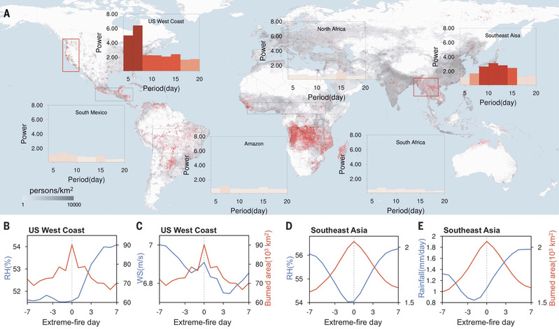 Fig. 1. Synoptic-scale variability of wildfires and meteorology during extreme fires in typical fire regions in the globe.