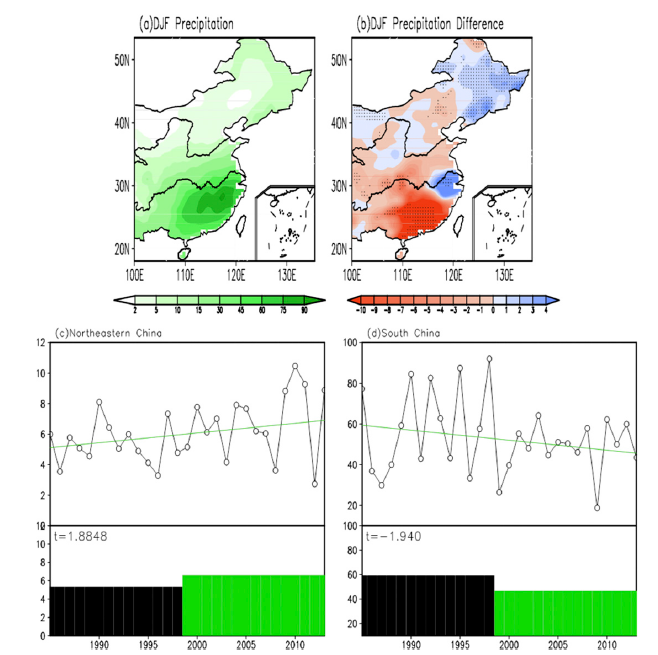Fig 2. The 1985–2013 mean winter (DJF) precipitation over (a) eastern China (mm), (b) precipitation difference (mm) between 1999–2013 and 1985–98, and the time series of the regional-mean winter precipitation averaged over (c) northeastern China (40°–54°N, 120°–135°E) and (d) southern China (20°–28°N, 105°–122°E) for 1985–2013. The dots in (b) indicate that the difference is significant at the 90% level. The green lines in (c), (d) are linear trends. The black (green) bars in (c), (d) indicate the mean winter precipitation in 1985–98 (1999–2013).