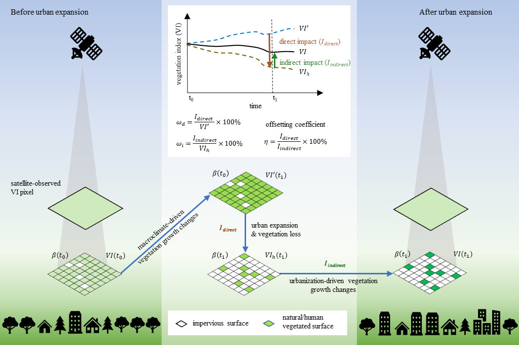 More than half of the world's population now lives in cities, and the urban population will increase by approximately 2.5 billion by 2050. As a critical regulator of the urban climate and the environment, vegetation plays an important role in alleviating urban heat, affecting air quality and improving human health outcomes. Under ongoing urbanization, the importance of urban vegetation has become increasingly prominent. However, driven by global climate change and rapid urbanization, vegetation in urban and peri-urban areas has undergone profound changes. On the one hand, urbanization causes substantial vegetation loss due to landcover transitions from natural vegetated surfaces to impervious surfaces (direct effect of urbanization). On the other hand, changes in the urban environment (e.g., the UHI effect, elevated CO2 emissions and nitrogen deposition) and human management practices promote the growth of urban vegetation (indirect effects of urbanization). Although previous studies have quantified the direct and indirect effects of urbanization on vegetation growth based on “space-for-time” method at the urban‒rural gradient, from the perspective of temporal dynamics, the extent to which these direct and indirect impacts affect vegetation dynamics across global cities and how urban greening will change in the future remain unclear.