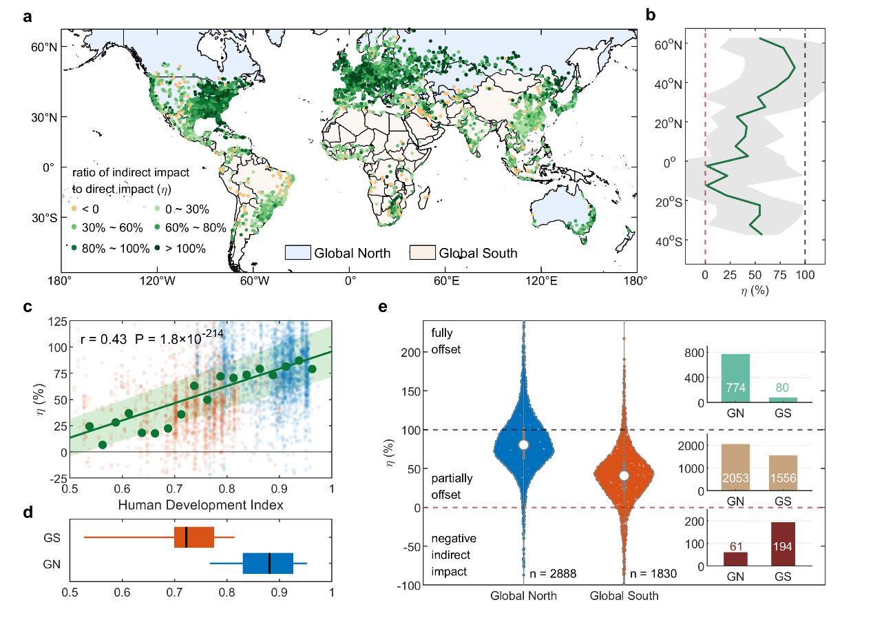 Figure 2. Differences in the offsetting coefficients of the indirect impacts to direct impacts across 4,718 cities worldwide.