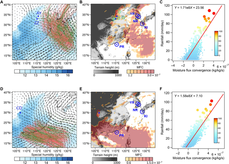Fig. 2. Simulated changes in extreme rainfall due to an increase in typhoon intensity. (A) Average specific humidity distribution and wind field at 850 hPa when northward typhoons occur; total of 261 cases. Tracks of weak and strong typhoons are shown in green and red lines. (B) Changes of upper quartile of maximum moisture flux convergence (MFC) between simulations with strong and weak typhoons. Blue circled dots give the locations where mid-late Holocene typhoon proxies used in this study are retrieved. Green circled dots show the distribution of flood deposits that document flood events around 3000 yr B.P. when northward typhoon activities increased. (C) Scatter plots of MFC and daily rainfall in the Central Plains [red box in (B)] in summer time during 1950 to 2021. The red line shows the reduced major axis regression, which was set using the fitting function labeled on the top-left corner. (D to F) Same as (A) to (C) but for westward typhoons (total of 319 cases), MFC, and daily rainfall in the Chengdu Plain.