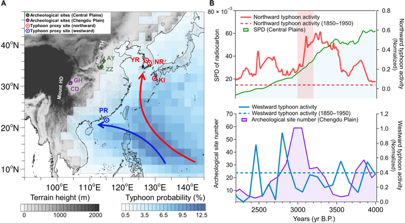 Fig. 1. Temporal changes in typhoon activity, population size (Central Plains), and archeological site number (Chengdu Plain) during the mid-late Holocene. (A) Distribution of typhoon probability in modern times (1950 to 2021) and the locations of archeological sites and paleo-typhoon proxies used in this study. (B) Fluctuations in normalized northward typhoon activities and variations in population size in the Central Plains [represented by the reconstructed summed probability distributions (SPD); top]; fluctuations in westward typhoon activities and the temporal distribution of archeological sites in the Chengdu Plain (bottom). The red (blue) dashed lines give the northward (westward) average typhoon activities during 1850 to 1950. The time range of oracle bone scripts is indicated by the red translucent strip on the top panel.