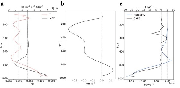 Through water vapor tracer analysis, the team found that 76.9% of the precipitation reduction in the dry season was attributable to decreased non-local water vapor input, and only 23.1% to reduced local evapotranspiration. Additionally, atmospheric responses to local water cycle changes amplified precipitation reduction: deforestation reduced surface evapotranspiration and latent heat flux, leading to surface drying and warming, reduced low-level specific humidity, and decreased Convective Available Potential Energy (CAPE), thereby suppressing convective activity and precipitation. Quantitative analysis showed that reduced precipitation efficiency accounted for 84.5% of the dry season precipitation decline, while cooling in the upper troposphere further limited high-altitude vapor input.