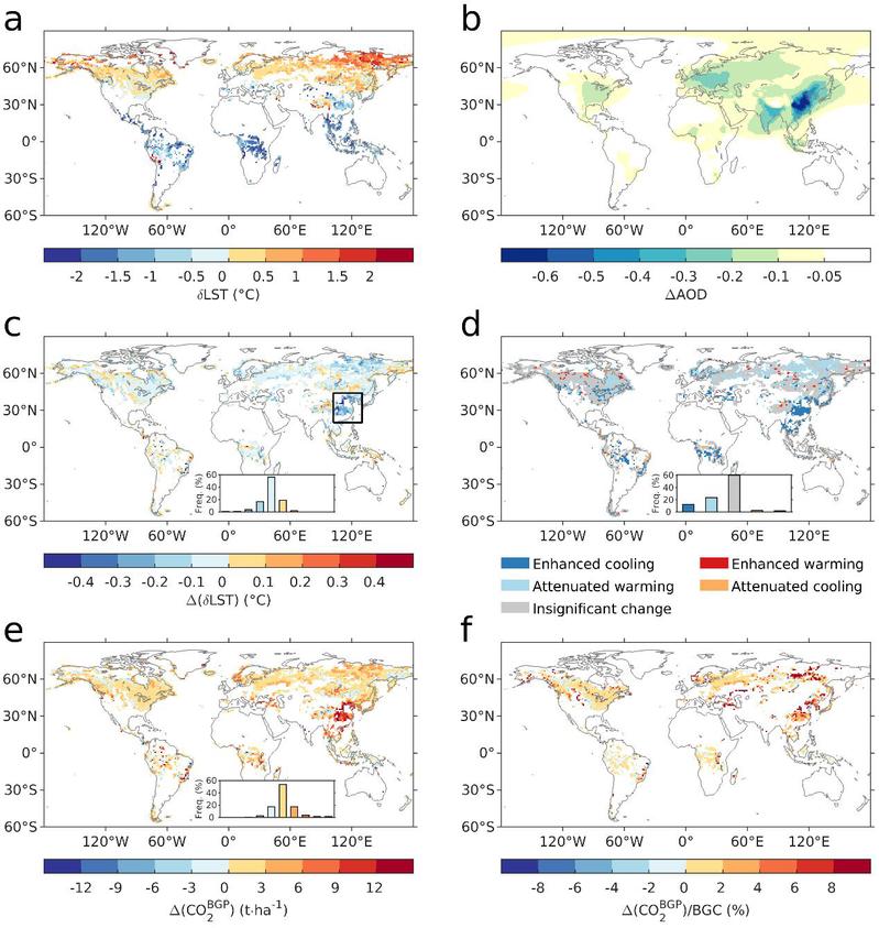 Figure 1 Impacts of anthropogenic aerosol emission reductions on the local temperature effects of afforestation