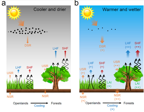 To address this scientific issue, Weidong Guo and Xin Huang's team from the School of Atmospheric Sciences, Nanjing University, compared the local temperature effects of afforestation across multiple anthropogenic aerosol emission scenarios based onan earth system model of the Coupled Model Intercomparison Project Phase 6 (CMIP6). The results show that if current anthropogenic aerosol emissions are reduced to preindustrial levels, the local cooling effect of afforestation in the mid- and low-latitudeswould be enhanced (up to 0.4°C); the additional cooling effect can partially offset the warming effect of aerosol reductions (Figure 1). Meanwhile, the local warming effect of afforestation in the high-latitudeswould be attenuated. The change in the local temperature effectsof afforestation caused by aerosol reductions is equivalent to an additional 0-8% CO2 absorbed by afforestation. A surface energy balance-basedattribution analysis shows that aerosol reductions lead to more surface solar radiation, and the increased solar radiation is more partitioned into sensible and latent heat fluxes due to the higher roughness and transpiration efficiency of forests, resulting in surface cooling (Figure 2). The model projects that if strict aerosol emission control measures are adopted, the local cooling effect of afforestation in China would be enhanced by 0.13°C in the middle of this century.