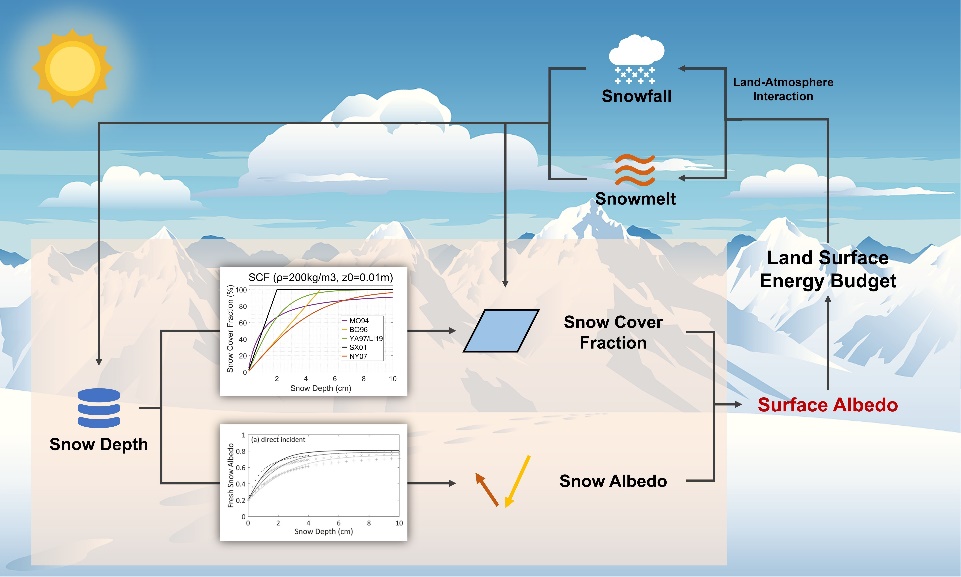 Figure 1. “Snow-albedo” feedback process dominated by the “surface albedo-snow depth-snow coverage” relationship is the underlying mechanism of rapid snow cover change on the Tibetan Plateau.