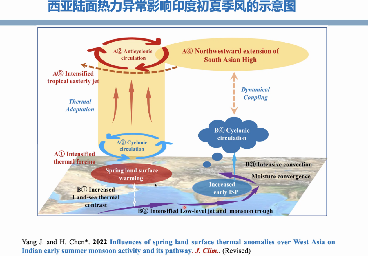 最后一部分介绍了西亚春季陆面热力异常对印度季风的影响,印度季风降水和春季地表热力异常相关,降水多可能会引起温度减少。陈老师指出陆面的前期信号是大气,而陆面响应的存储时间暂时是不清楚的,在次季节尺度上,陆面过程的作用更能发挥出来。本次讲座主要讲述了对西亚陆面热力异常的年际、年代际变化成因及气候效应的一些新认识,为深入理解西亚地区陆面过程的气候效应以及我国初夏短期气候预测提供参考。