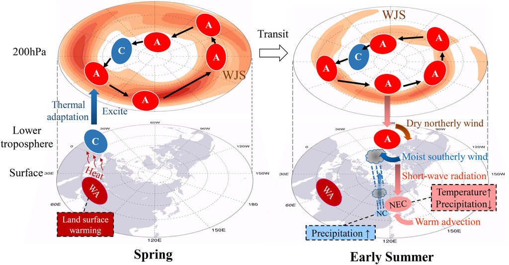 在第二部分主要介绍了西亚陆面热力异常与我国北方夏季气候的联系,主要的研究结果表明,西亚春季异常陆面增温在初夏(6月)有导致华北降水增加和减少(增加)东北降水(气温)的趋势,华北/东北东部地区降水异常更为强烈。进一步分析表明,春季陆面异常增温可通过非绝热加热触发向东传播的扰动,增强大气环全球遥相关(CGT)模态,导致中国北方地区初夏环流和气候异常。敏感性试验表明,春季异常陆面增温会增加大气斜压不稳定性,触发沿着西风急流(WJS)传播的Rossby波,导致CGT的形成。由于持续的地表热强迫和基本气流(特别是WJS)与CGT的相互作用,使得CGT有增强的趋势。初夏东亚异常波动中心导致中国北部(东北)降水增加(减少),东北地区增温明显。春季西亚陆面热力异常可作为中国北方地区初夏气候短期预报的潜在信号。
