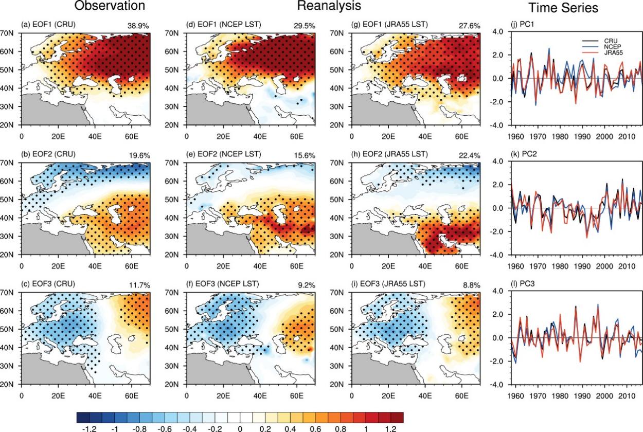 第一部分的研究主要介绍了西亚春季热力异常模态并从地表能量收支的角度阐述了大气遥相关型通过改变云和水汽对地表温度异常的作用。欧亚西部春季陆面热力异常有3个主要模态,第一模态表现出同期增温,与斯堪的纳维亚和东大西洋/俄罗斯西部(EA/WR)模态的负同相结合密切相关。在异常反气旋主导下,增暖与向下长波辐射的增加有关,这主要是由于在偏暖的大气中水汽含量多,而云量减少会导致异常偏南气流和更多的太阳辐射。第二模态以北大西洋涛动为主,表现出经向偶极型。西欧上空和里海上空分别出现了异常气旋和异常反气旋,前者主要由云-短波辐射过程引起,后者主要由水汽引起的向下长波辐射引起。第三模式为纬向偶极子型,主要受到与欧亚型相关的水汽温室效应影响。研究结果可为气候预测提供基础。