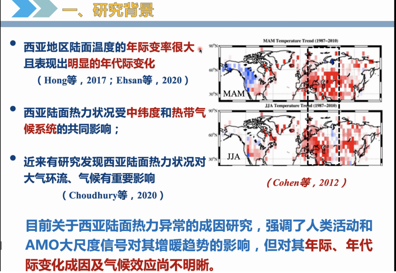 首先陈老师介绍了陆面在作为地球各圈层中的作用,以及在整个气候系统中的重要性。欧亚大陆是世界上最大的大陆,近几十年经历了剧烈的气候变化,特别是暖季变暖显著。20世纪90年代中期以后,欧亚大陆温度变化最为激烈、增暖最为显著并且存在明显的区域性差异,因此欧亚不同区域的陆面过程及其影响受到越来越多的关注。