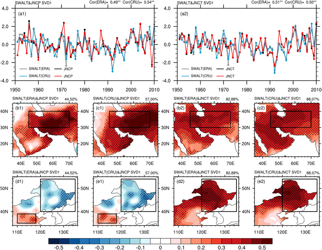 图4 西亚春季热力异常与北方降水和温度的SVD 分析