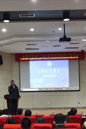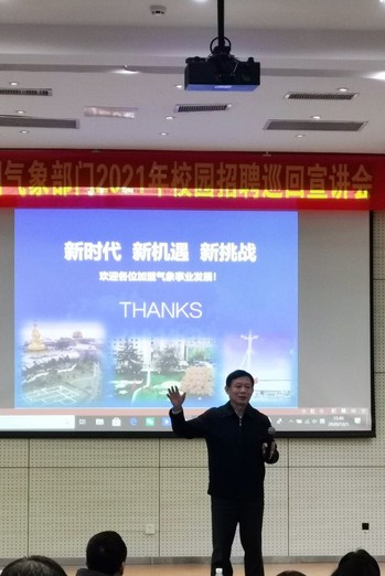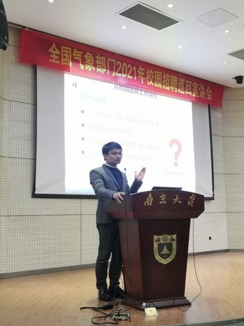 公司党委潘益农书记首先致辞,他对中国气象局各位领导的到访表示了热烈的欢迎。随后,许小峰研究员做了中国气象局2021年公开招聘宣讲报告。报告主要梳理了中国气象发展的历史脉络,着重介绍了气象事业发展的两个重要阶段,并对未来气象科技的发展进行了展望,获得在场老师和同学们的热烈掌声。