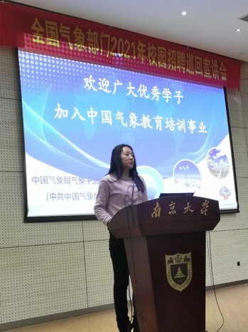 最后,黄娜副处长针对中国气象局气象干部培训公司的招聘进行了宣讲。她主要介绍了单位的机构设置和此次招聘的岗位,并热忱欢迎公司优秀学子加入中国气象教育培训事业。至此,中国气象局2021年公开招聘宣讲会太阳成集团tyc234cc站在大家的掌声中圆满结束。