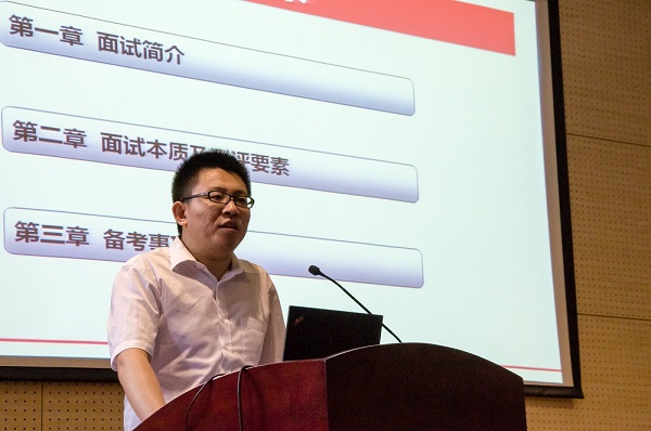 第一场讲座于中午12:30开始,由鲍仕广老师为大家进行介绍。参与这次讲座不仅有研究生,还有本科生同学。鲍仕广老师从以下三个方面为大家进行了介绍:一是面试简介;二是面试本质及测评要素;三是备考事项。在事业单位更多采取的是结构化面试,应对结构化面试的关键是把握好自己的心态,克服自己的紧张感。还有一种方式是无领导小组讨论,这种面试方式的操作难度更大,对应聘者的要求也更高,这个时候要体现出自己统领全局的气魄与智慧才能脱颖而出。对于面试技巧及测评要素的介绍,鲍老师重点从人员和岗位匹配这个角度为大家进行了讲解,包括形象、能力、心理这三个方面。形象上要表现出“仪表堂堂、情绪稳定、自信从容”。心理上要做到“阳光心态、考官/政府思维”,也就是要从好的方面去审视别人,要换位思考,站在考官或政府的角度考虑问题。能力上要体现出“综合分析能力、计划组织协调能力、应变能力、人际交往意识与技巧、求职动机与拟任职的匹配性、言语理解与表达能力”。最后鲍老师还从高分关键和备考事项方面为大家进行了介绍,鲍老师提到面试培训或许能让你在短期内掌握一些技巧及注意事项,但一个真正优秀的有思想的应聘者还是要靠平时的积累,要在平时多答题、多总结、多思考,另外可以多看看像《新闻1+1》、《南方周末》这样的新闻及评论节目或刊物,多参加校内外的活动,只有平时多积累多思考才会提高我们思想的深度。