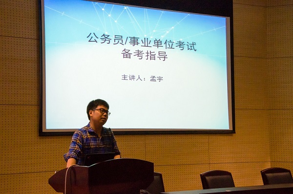第二场讲座在当天18:30准时开始,给大家作事业单位笔试培训的是孟宇老师。孟宇老师有着丰富的实战经验,他从公职考试概况和备考方式及注意点两个部分给同学们作了入门级的培训。孟老师给大家介绍了公考考试时间和各个地区的特点区别,考试内容包括公共基础知识、行测和申论,他建议同学们以公务员考试的标准准备事业单位。孟老师以江苏省考为例分别讲解了言语理解与表达、判断推理、资料分析和数量关系这几种类型的行测题目,给大家提出复习重点和中肯的建议。公考已经进入深度复习的时代,大家必须做好充分的准备。最后,孟老师针对不同的复习阶段给大家介绍了经典教材和备考材料。孟老师以自己丰富的实战经验给同学们很多中肯和实际的建议,对即将开始准备求职的同学们有很大的帮助。