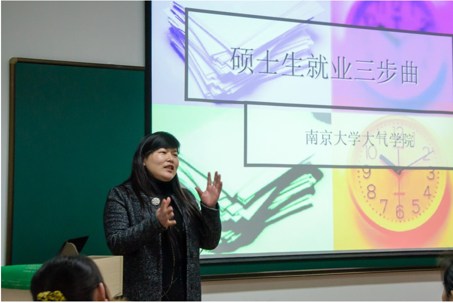 在学长学姐们发言结束后,喻老师为我们做了一个总结报告,首先喻老师提出当前的就业形势的确比较严峻,所以求职时一定不要仓促上阵,及时地开始准备。喻老师为大家展示了其他兄弟院校毕业人数、市场招聘人数的数据,表明行业的需求量仍然较大,同学们有一定的求职空间。老师还分析了气象局、空管局、电力、水利相关单位的一些基本情况和区别,希望同学们针对自己的实际情况,选择适合自己的、有利于长远发展的领域,有的放矢。她形象地称求职过程为“三部曲”。从蓄势阶段的课程学习和发表论文,到预热阶段的了解政策、毕业情况、笔试面试准备和暑期实习,最后再到实战阶段的支撑材料准备、投递简历和正式的笔试面试。喻老师表达了院领导和老师会一如既往积极帮助同学们求职的立场,也鼓励大家积极应对求职这个人生中非常重要的关卡,积极准备,保持良好的心态,充满自信,勇于尝试,那么每个人都会有一个满意的结果。