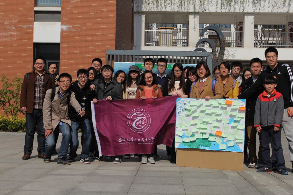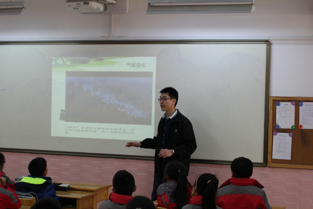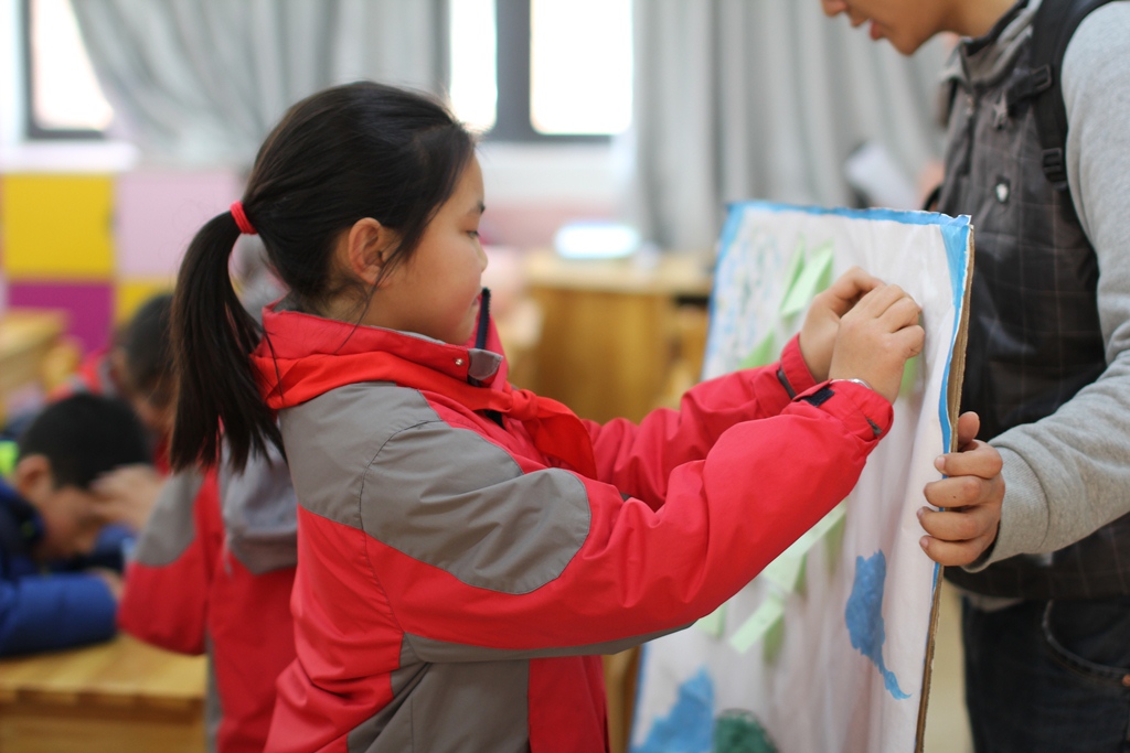 科普阶段结束之后就是孩子们喜闻乐见的游戏环节了,当听到有彩虹糖做奖品时,小朋友们一下子炸开了锅,纷纷上台参与。最后娱乐组的同学只能采用抽号决定的方法。被叫到的小朋友都是一脸幸福。识天气、造句,玩儿得不亦乐乎。游戏有效带动了气氛,班里热闹欢腾。孩子们的表现也再一次震惊了我们,知识面之广让人敬佩。更有孩子叫出了我们将要介绍的仪器的名字,祖国的未来一片光明啊。最后,大家在留言板上写下了对地球妈妈的祝福,我们也希望孩子们从小就注意身体力行保护环境,为世界未来思量。