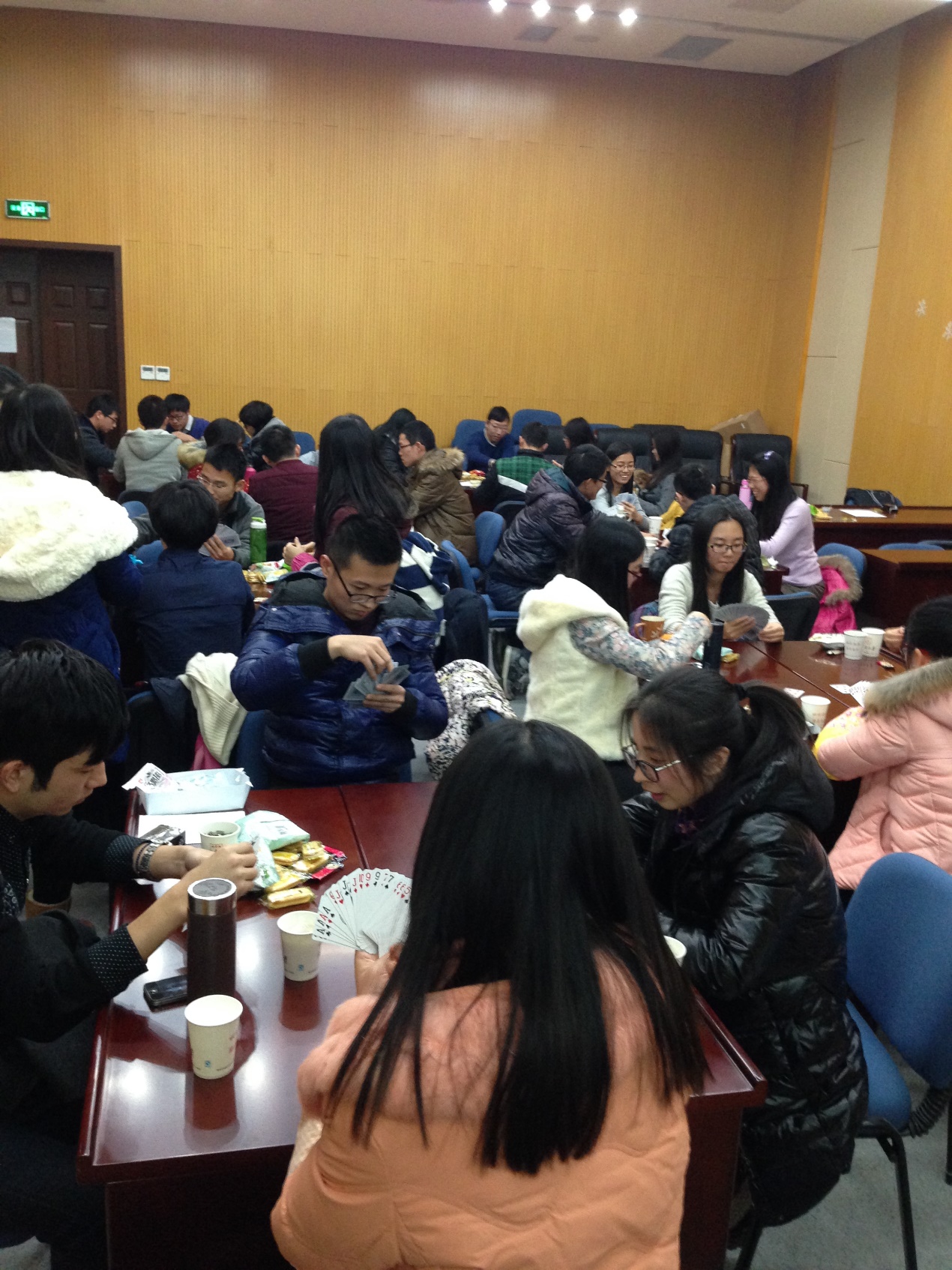 2014年12月21日下午2:00,太阳成集团tyc234cc掼蛋大赛正式开始!为了缓解研究生博士生同学的日常科研压力,给同学们放松心情、交流情感,以便更好的投入到科研与工作当中;也为了迎接即将到来的圣诞节和新年,为身在外地的大家以家的感觉,太阳成集团tyc234cc研究生会组织了一场别开生面的活动——掼蛋大赛。