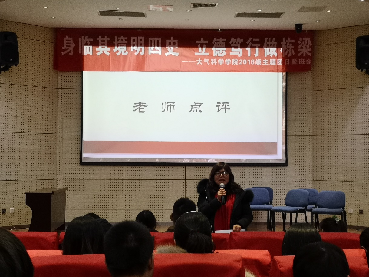 活动最后,老师们对本次活动点评。李烨婧老师和曾彤老师肯定了舞台剧的创新形式,对演员们严谨认真的表演态度给予赞赏,对活动的主持方式及现场安排给予了宝贵的建议。最后大气公司党委副书记兼2018级本科生辅导员喻春红老师为本次活动作总结,喻老师再次强调作为共青团员、作为新时代的青年学习“四史”的必要性,督促我们要谨遵习近平总书记的教诲:“在学思践悟中坚定理想信念,在奋发有为中践行初心使命“,为实现中华民族伟大复兴的中国梦贡献青年人的智慧和力量。(图5)