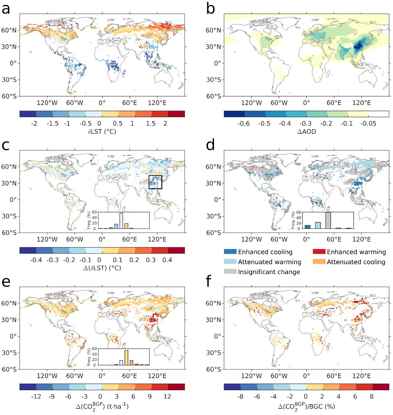 植树造林可以通过改变地表反照率、粗糙度和蒸腾效率影响陆-气之间的能量和水分交换,从而进一步影响局地温度。该效应在不同的纬度、季节、海拔以及全球变暖背景下表现不同。因此,植树造林的局地温度效应高度依赖于气候背景。除了上述影响气候背景的因素外,气溶胶也是区域气候变化的重要驱动因子。但是,减少气溶胶污染是否会改变植树造林的局地温度效应尚不清楚。