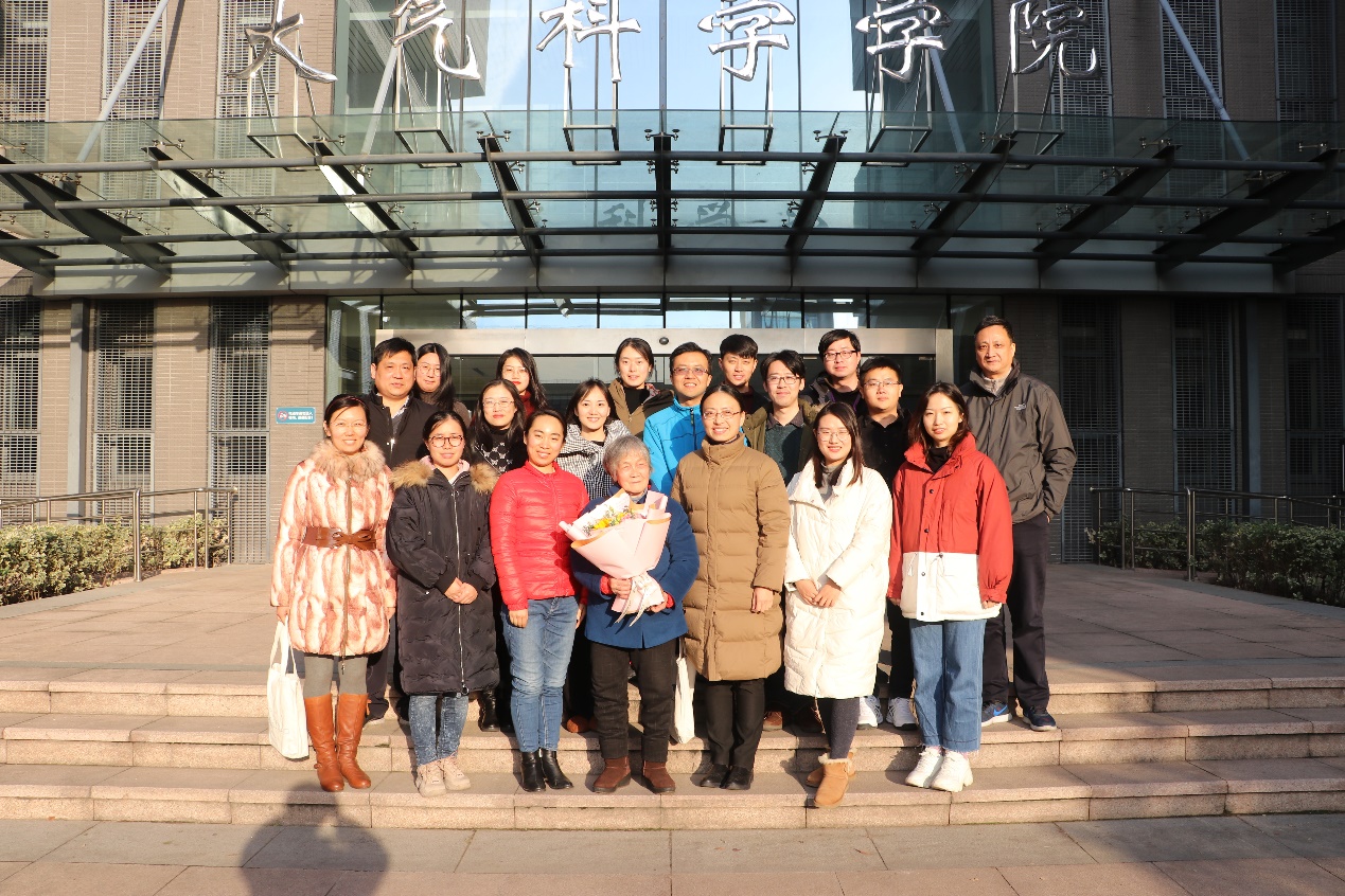 党委书记潘益农、党委委员张熠以及职工党支部全体党员与廖蔚训老师合影