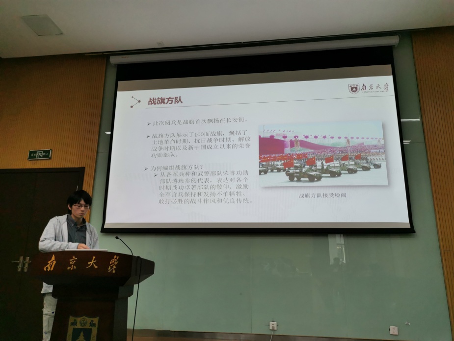 此次活动中,全班同学分成了七组,经过充分的前期准备后,分别展示了本组同学对于此次阅兵盛典的非凡感受。七组同学分别以“70周年阅兵战旗方队”“原子弹爆炸成功的幕后故事”“历届阅兵的变化与发展”“国庆阅兵上的花车”“女兵方阵”“大国重器—战略打击方阵背后的故事”“部分武器装备简介”为主题,进行了精彩的展示。大家的切入角度各异,内容丰富多彩,既有对阅兵盛况的客观回顾,也有自己独到的主观感受,思维的火花在本次活动中产生了激烈地碰撞。