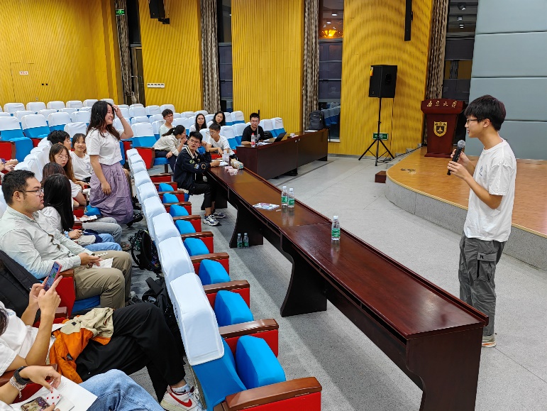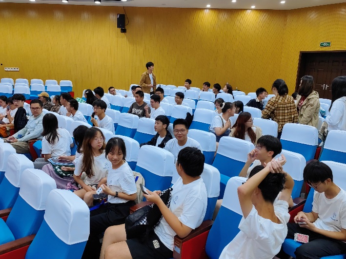 在"互动"环节中,同学们分为十个小组,每个小组内部组员互相自我介绍,初步了解,再选出小组代表上台,向所有人介绍自己的组员。现场气氛热烈,小组破冰带动班级破冰,大大增进了对彼此的认识与了解。