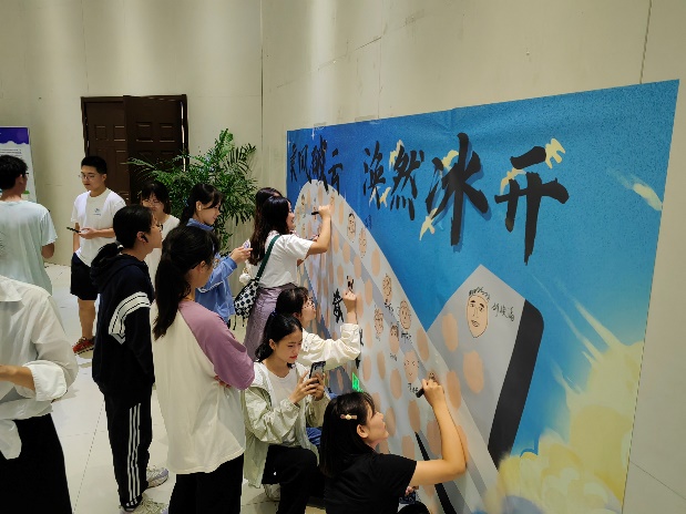 班会还未开始,同学们领取各自的小组卡牌。这些卡牌不仅代表着他们所属的小组,更是班级凝聚力的象征,随后,在入场背景板前,同学们用心地在上面签名和绘画,让整个板面变成了一副形象有趣的"全院速写"。这个板面成为了同学们欢聚一堂的见证,记录下了这个特别时刻的珍贵回忆。