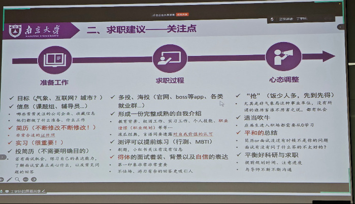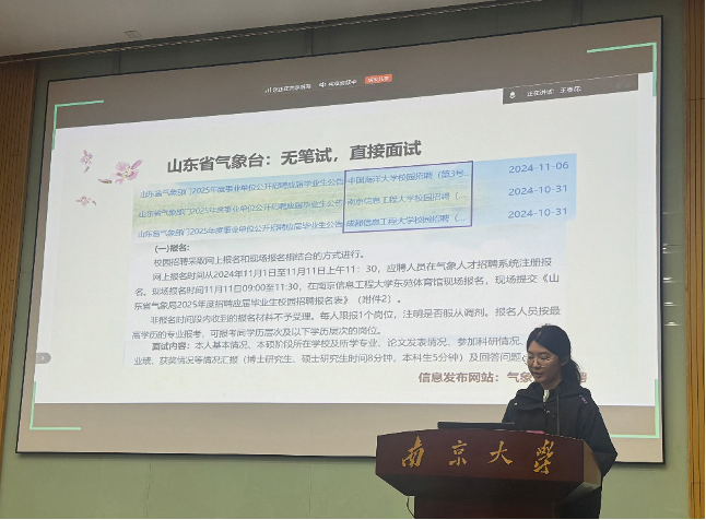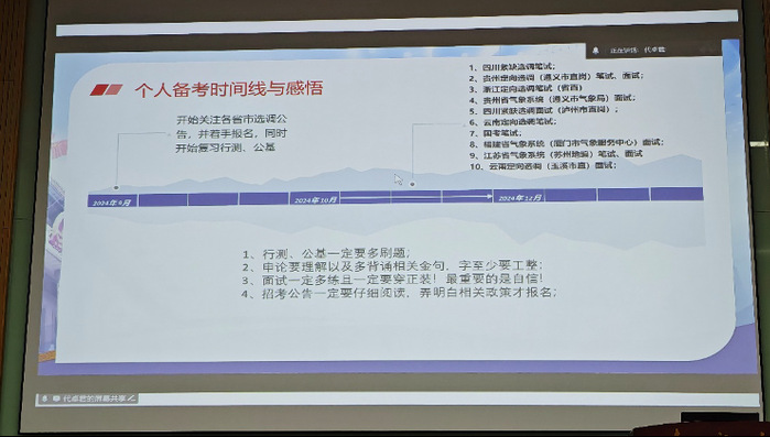 将在国家气象信息中心工作的任逸璇分享了她的秋招经历,强调了提前规划、积累实习经验的重要性,并建议积极参加各类招聘活动,同时提醒了同学们注意求职过程中的一些关键点;
