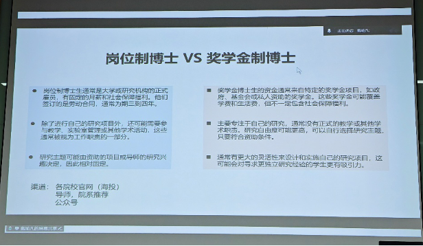 即将在芬兰赫尔辛基大学攻读博士学位的戴瑜凡(线上) 介绍了岗位制与奖学金制博士的区别,推荐同学们关注招聘信息的途径,提供了充实简历和突出未来研究设想的建议;