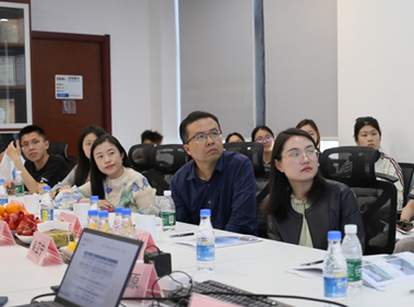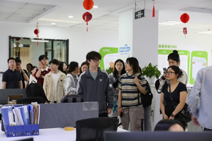 在交流环节,员工与企业代表深入探讨,现场气氛热烈。交流研讨后,师生走进企业研发中心,实地参观工作场景。