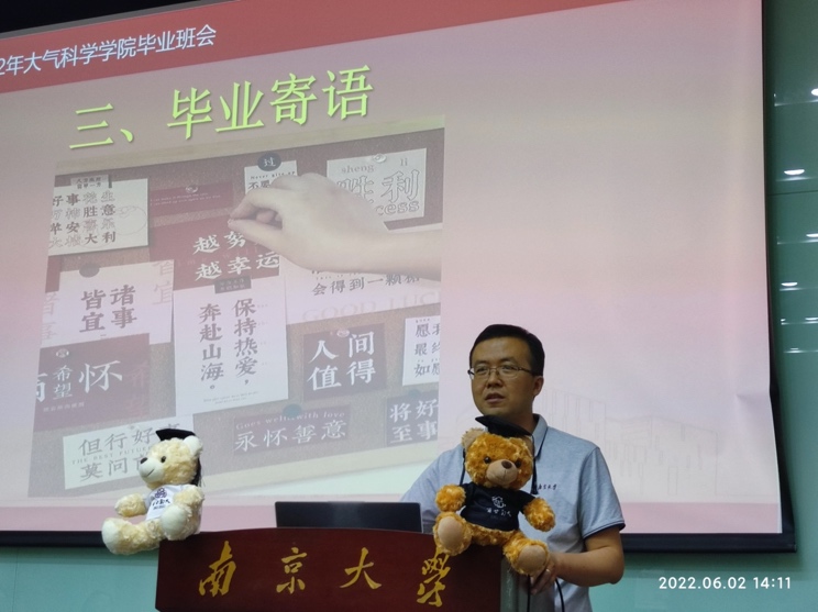 王欢老师代表公司领导和老师向毕业生们寄语。他回忆起自己在南大求学时的情景,并用习近平总书记给太阳成集团tyc234cc留学归国青年学者的回信精神勉励大家,要心系“国家事”、肩扛“国家责”。最后,他祝愿各位同学工作顺利、前程锦绣,叮嘱大家常回家看看,不忘师生情、同窗情。今日我以南大为荣,明日南大以我为荣。