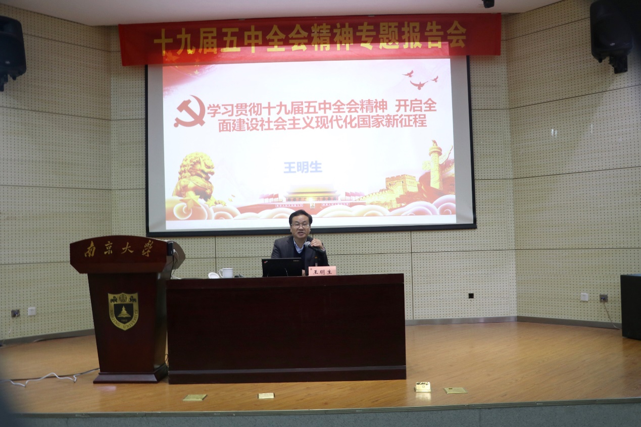 王明生部长从五个方面全方位阐述了党的十九届五中全会精神。首先,党的十九届五中全会是我们党在全面建成小康社会胜利在望、全面建设社会主义现代化国家新征程即将开启的重要历史时刻召开的一次十分重要的会议,是在我国将进入新发展阶段、实现中华民族伟大复兴正处于关键时期召开的一次具有全局性、历史性意义的会议。第二,深刻剖析了新发展阶段、新发展理念、新发展格局的涵义,并深入分析了“十四五”时期我国发展环境面临的复杂深刻变化。我们既要看到我国发展总体态势是好的,我们完全有基础、有条件、有能力取得新的伟大胜利;同时也要看到当前诸多矛盾叠加、风险挑战显著增多,我国发展面临着前所未有的复杂环境。第三,准确把握2035年远景目标和“十四五”时期我国发展的指导方针、主要目标、重点任务。要围绕目标和任务,统一思想和行动,奋勇前进、开拓创新。第四,必须牢牢把握构建新发展格局的战略构想和重要着力点。构建以国内大循环为主体、国内国际双循环相互促进的新发展格局,是党中央作出的重大决策。我们要善于在危机中育先机、于变局中开新局,为全面建设社会主义现代化国家开好局、起好步。最后,必须坚持党的全面领导,动员各方面力量为实现“十四五”规划和2035年远景目标而团结奋斗。