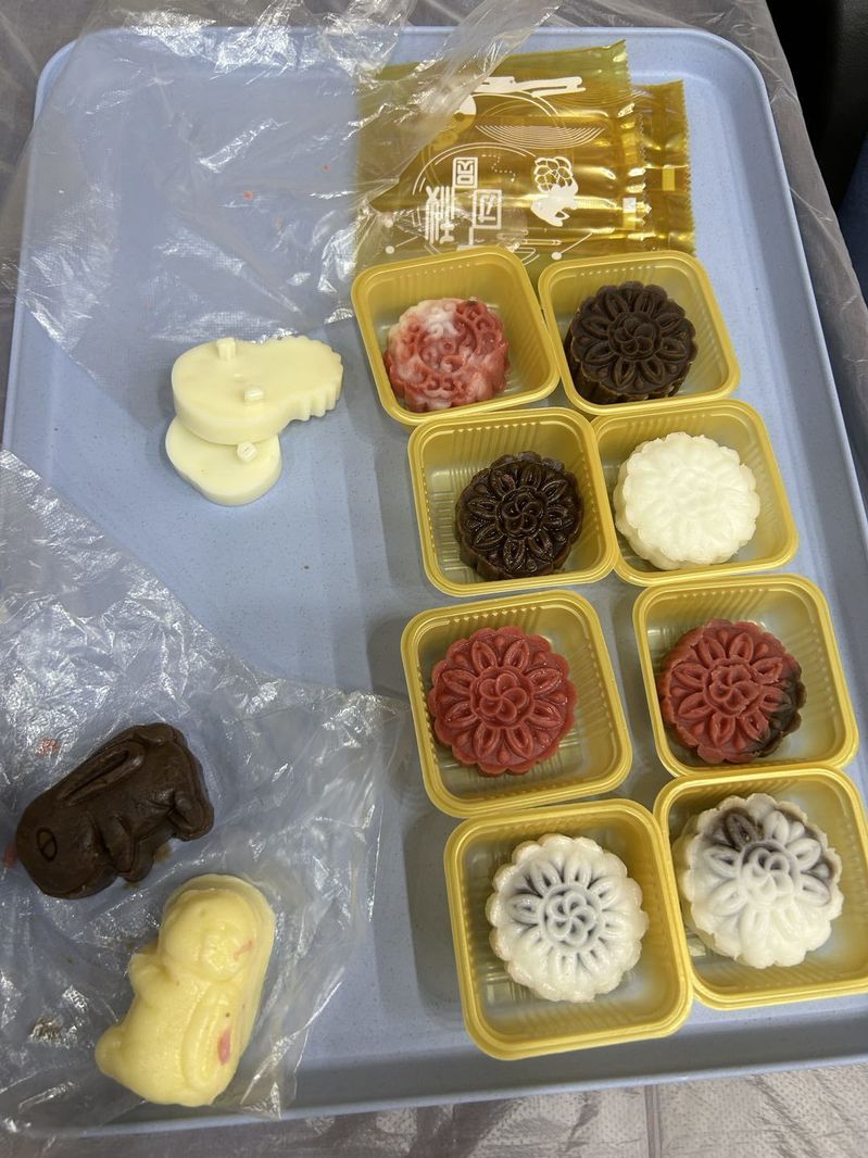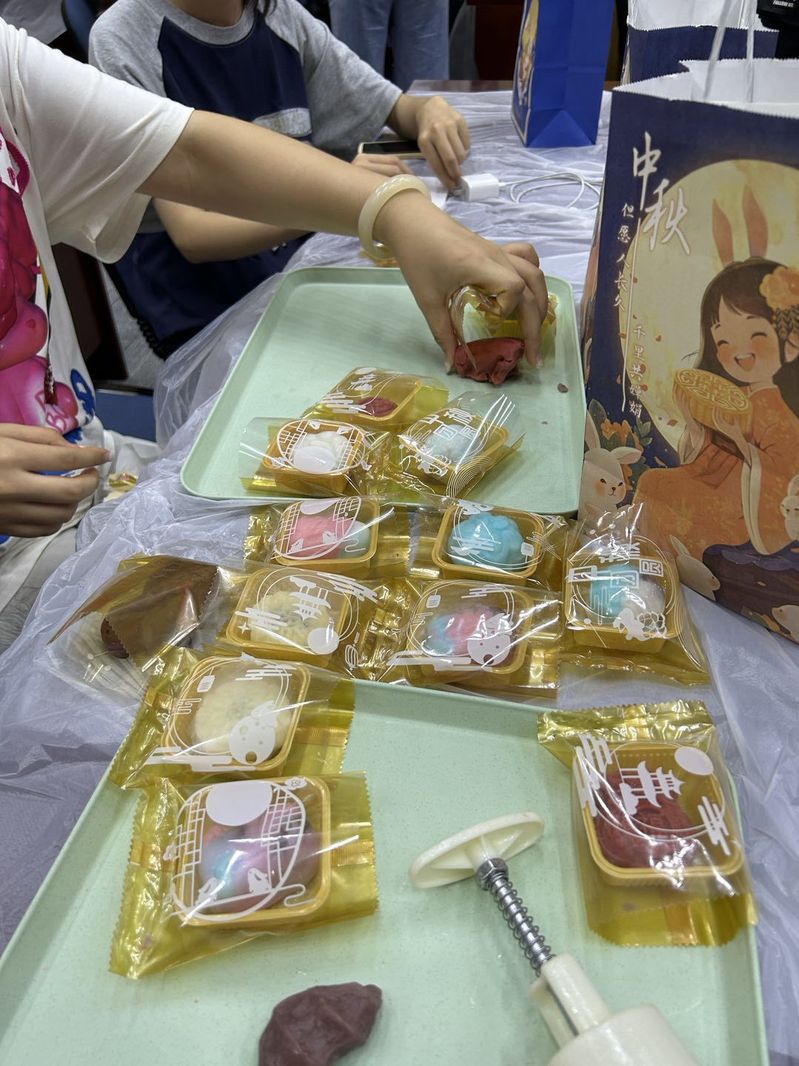 最后安排的是手工制作冰皮月饼活动。从进门开始,放在桌子上的莲蓉、板栗、西瓜等五颜六色的月饼馅料和花朵、兔子等形态各异的月饼模具就吸引了同学们的目光,而此刻终于到了最令人期待的手工制作月饼环节。制作月饼的过程看似简单,但制作的过程中却出现了各种“状况”。不过,同学们在这个过程中积极互动、热烈交流,或是分享自己成功的经验和技巧,或是互相鼓励、帮助彼此克服困难。最后,大家都成功制作完成自己的专属月饼。