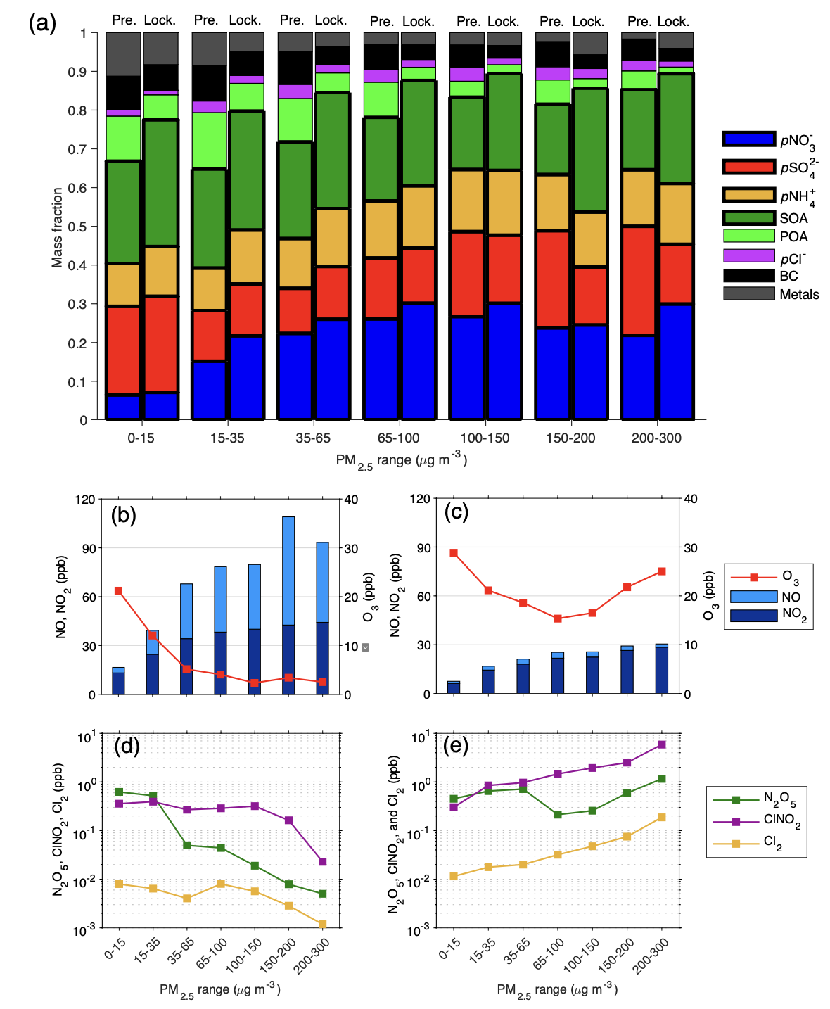 图1. 不同 PM2.5水平下 PM2.5成分和主要含氮化合物浓度在封锁前和封锁期间的对比。