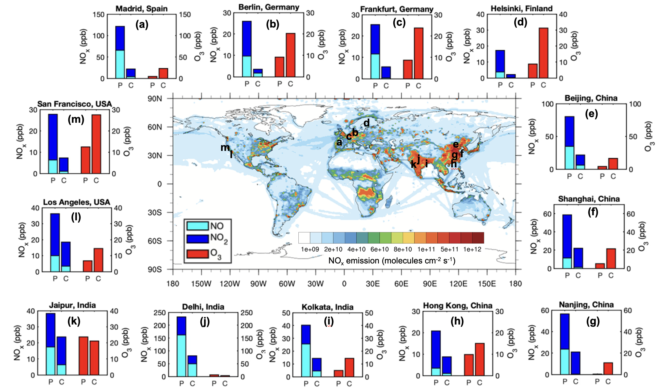 图2. 全球多个大城市的NOx和O3浓度在清洁(C)和污染(P)空气条件下的浓度对比。