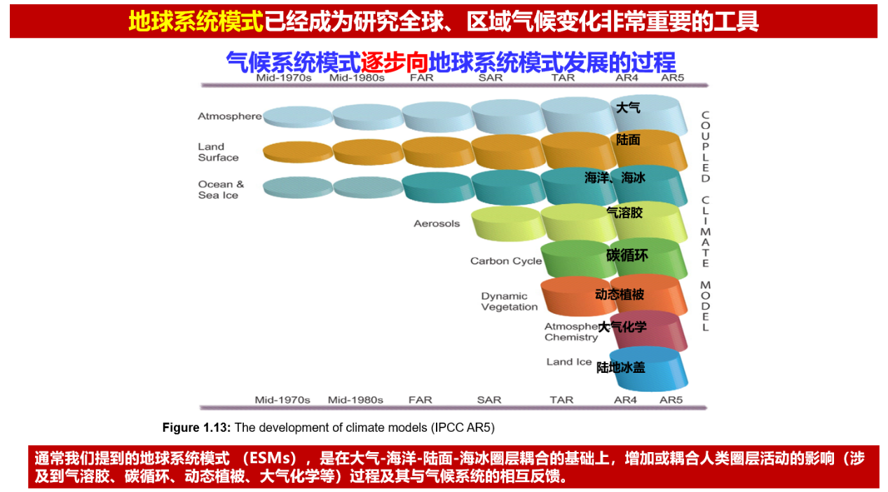 在本次学术报告中,吴老师首先介绍了当前国际地球系统数值模式的发展趋势以及为什么要发展我国的地球系统模式。随着对大气过程的深入研究,传统的气候系统模式正在逐渐向地球系统模式发展,从最初的大气环流模式,到逐渐耦合海洋,陆面过程,海冰圈层以及人类圈层活动的影响,目前的地球系统模式是融合了多个圈层,多个尺度的综合数值模式(图1)。