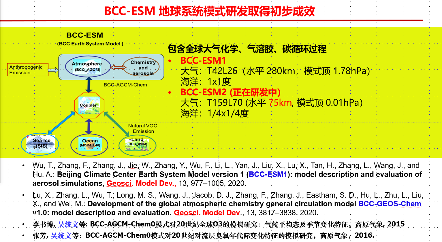 最后一部分吴老师介绍了考虑气溶胶、碳交换等各种精细的物理化员工物过程的BCC-ESM地球系统模式的发展近况,目前的BCC-ESM1已经包含了大气化学、气溶胶、碳循环过程,取得了一定的进展,但是分辨率较低,在后续的研发中将会继续提高模式分辨率完善相应的物理过程等(图5)。