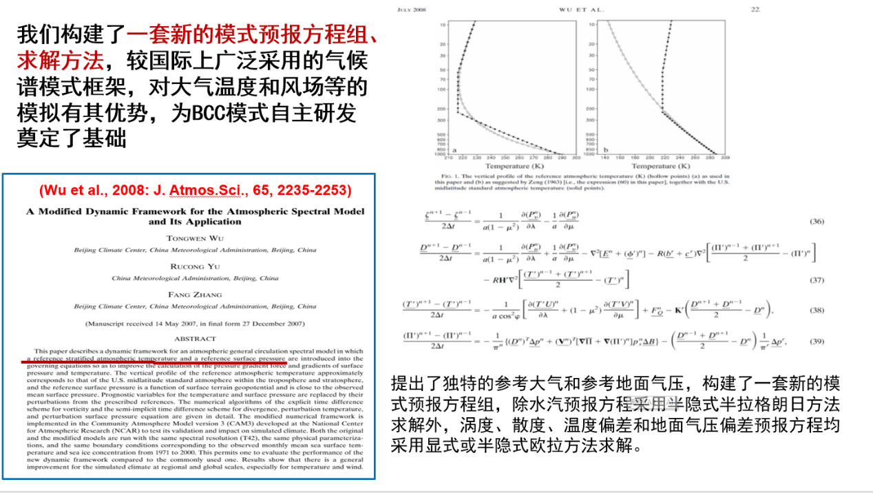 最开始的BCC模式是基于美国国家大气研究中心(NCAR)的Community Climate System Model(CCSM)模式,经历一系列调整之后,在2008年,吴老师及其团队构建了一套新的模式预报方程组及其求解方法,较国际上广泛采用的谱模式框架来说,对大气温度和风场等物理量的模拟具有其独特的优势,也为BCC模式的自主研发奠定了基础 (图2)。