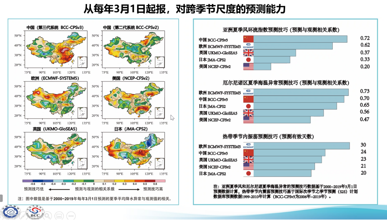 在业务应用上,吴老师介绍了中国气象局的相关团队研发的CMA-CPS模式(China Meteorological Administration Climate Prediction System),从第一代海-气耦合模式到第二代中分辨率的海-陆-冰-气多圈层耦合模式到如今的高分辨率气候系统模式,CMA-CPS模式的水平、垂直分辨率不断提高,物理过程也更加完善,对于不同时间尺度的预测效果也有所改善(图3)。这些业务模式都是基于BCC-CSM气候系统模式发展的,模式的水平分辨率和垂直分辨率的提升明显增强了对大气温度、风场垂直结构的模拟、以及对赤道平流层纬向风的振荡(QBO)、热带季节内振荡(MJO)以及热带气旋的模拟效果。在CMIP6的高分辨率模式中,尽管BCC-CSM2-HR的垂直分辨率相比其他模式低,但是对于中国地区的地面气温、降水的模拟在国际上更有优势。次季节到季节尺度的预测(S2S)也是国际上的热点。近几年发展更新的第三代CMA-CPSv3能够实现次季节、季节至年际一体化预测,其预测水平在国际上也是处于领先位置的(图4)。